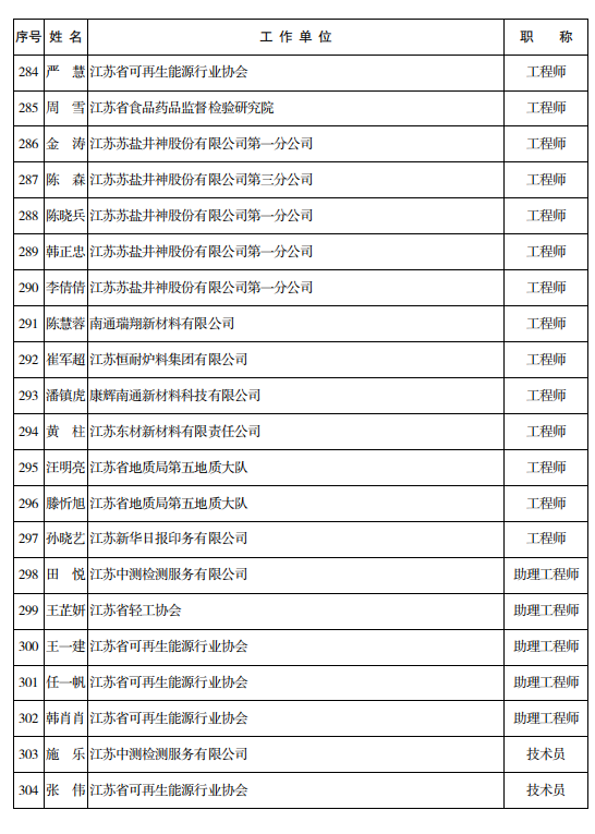 根据江苏省职称工作领导小组办公室统一部署,经江苏省轻工工程高级专业技术资格评审委员会评审通过,唐晋等 47 人已具备正高级工程师资格、徐凤鸣等 219 人已具备高级工程师资格、郑天平等 31 人已具备工程师资格、田悦等 7 人已具备初级工程师资格,现予以公布。